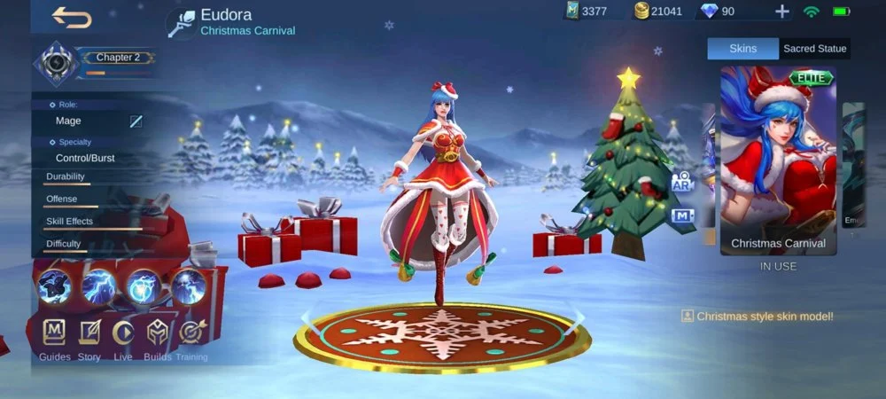 • Kenapa Cocok untuk Pemula: Eudora adalah salah satu Mage termudah untuk digunakan pemula, dan skin ini memberikan tampilan ceria dengan tema Natal. Biasanya skin ini dirilis gratis selama event akhir tahun.
